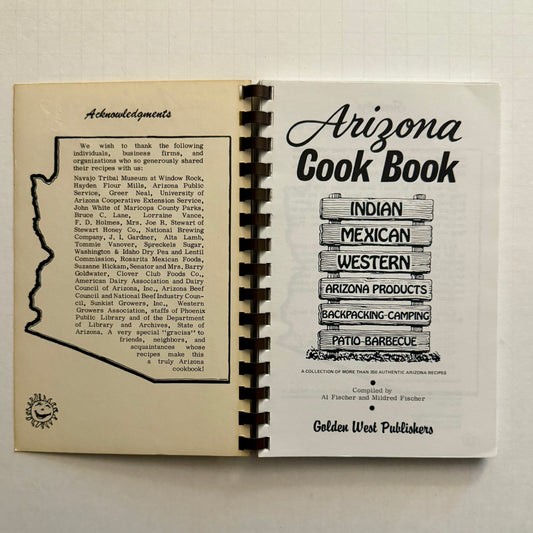 Arizona Cook Book : Indian, Mexican, Western, Arizona Products, Backpacking‑Camping, Patio‑Barbecue” – spiral-bound regional cookbook