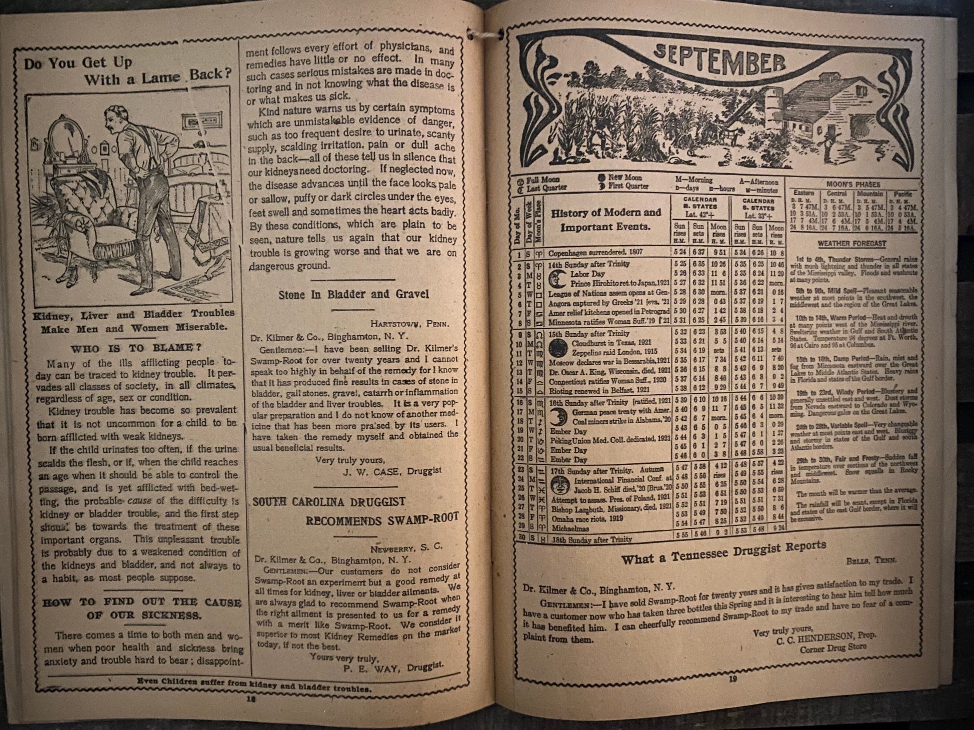 Step into the early 1920s with this original 1923 Swamp Root Almanac, published by Dr. Kilmer & Co., the makers of the famous herbal remedy Swamp Root. This beautifully illustrated almanac is a fascinating piece of American patent medicine history, blending early 20th-century advertising with practical wisdom for everyday life.