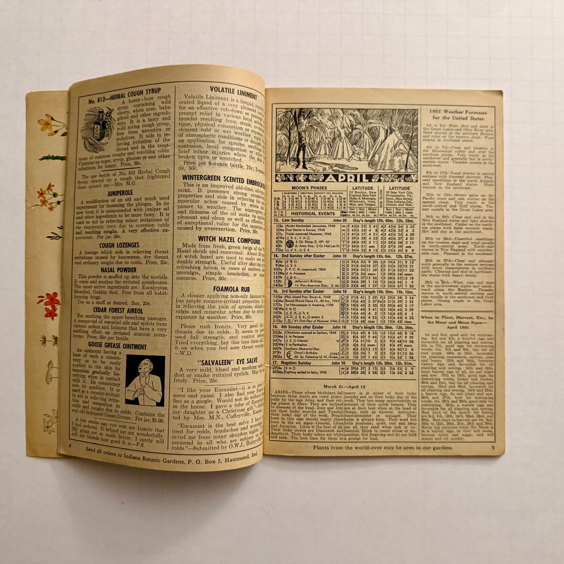 Published by Indiana Botanic Gardens (Hammond, Indiana) and originally produced under the auspices of herbalist-publisher Joseph E. Meyer, this 1951 almanac is a slim yet richly evocative 64-page softcover booklet of herb lore, native-plant wisdom, weather and planting guidance, and folklore.