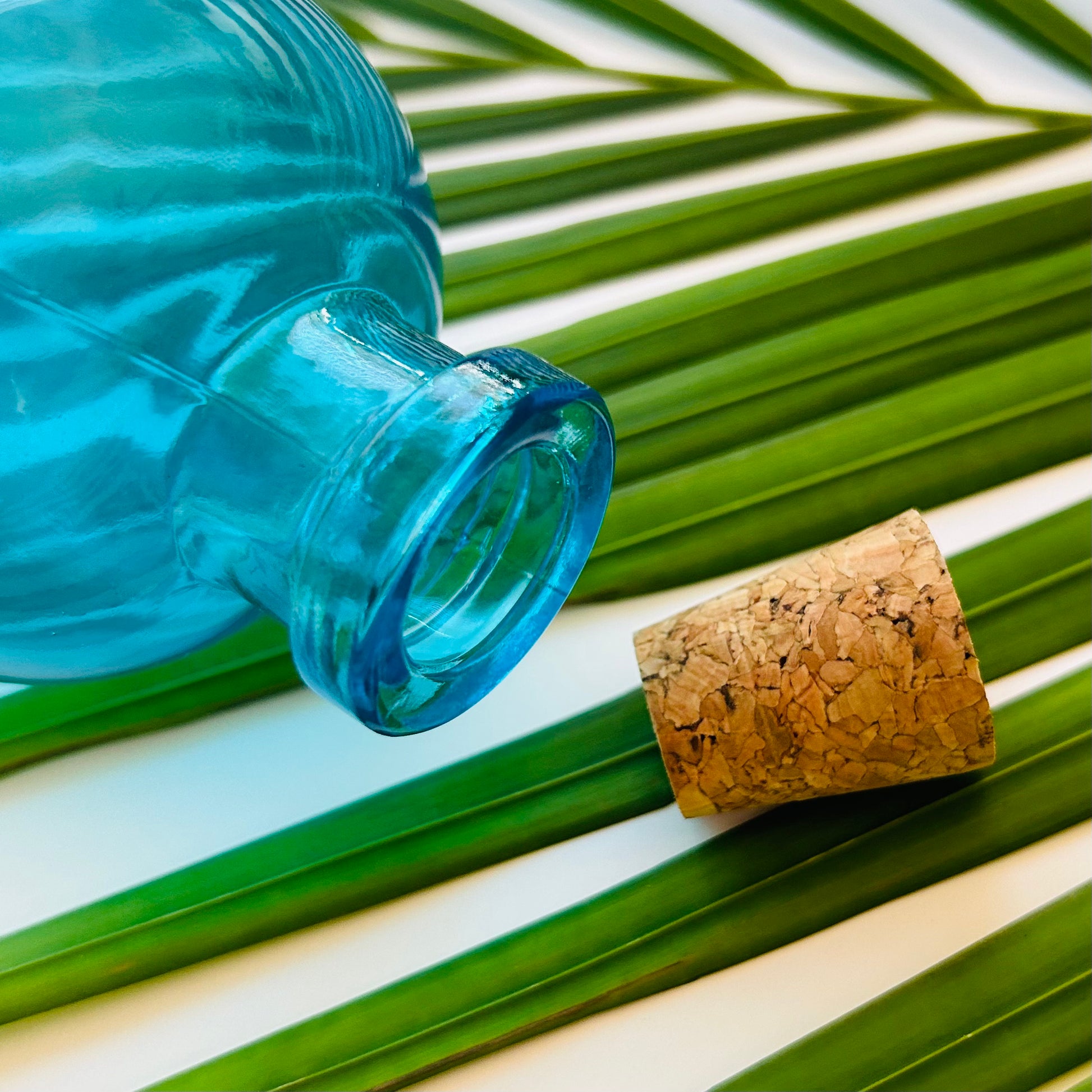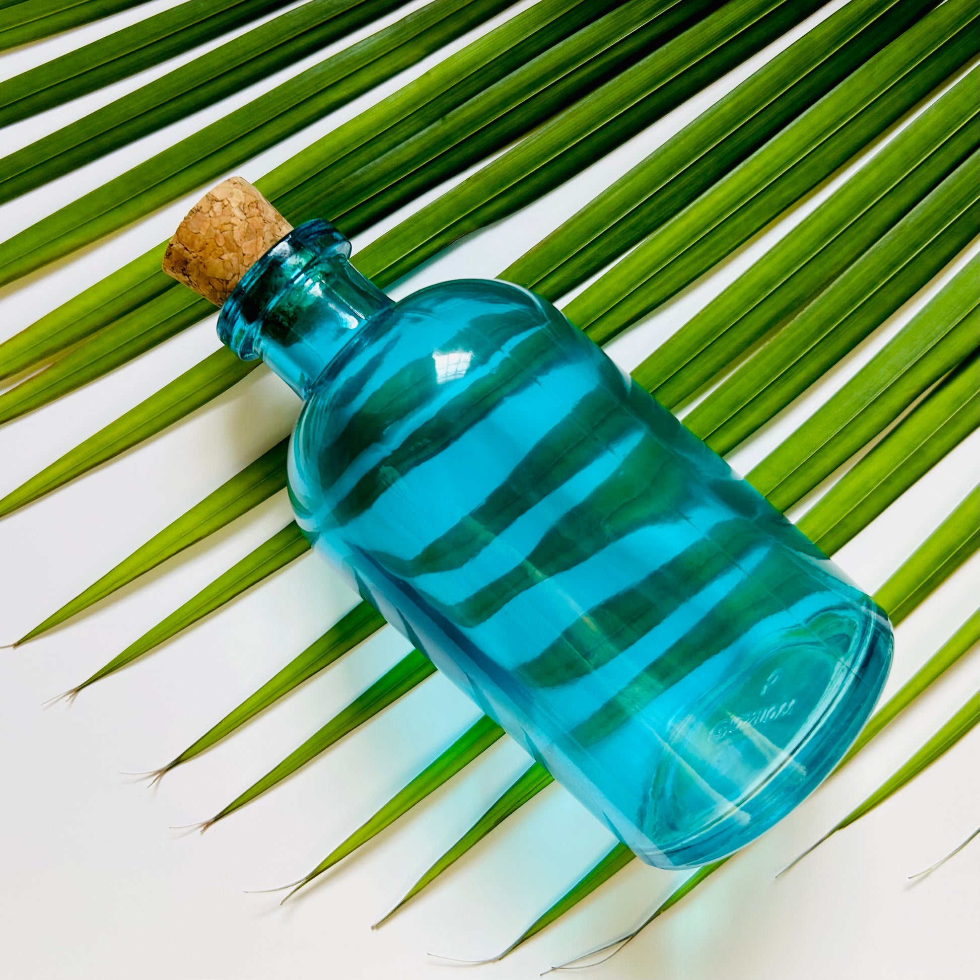 This stunning bottle is more than just a container; it's a statement piece that elevates any space with its vibrant aqua blue hue and timeless apothecary design.