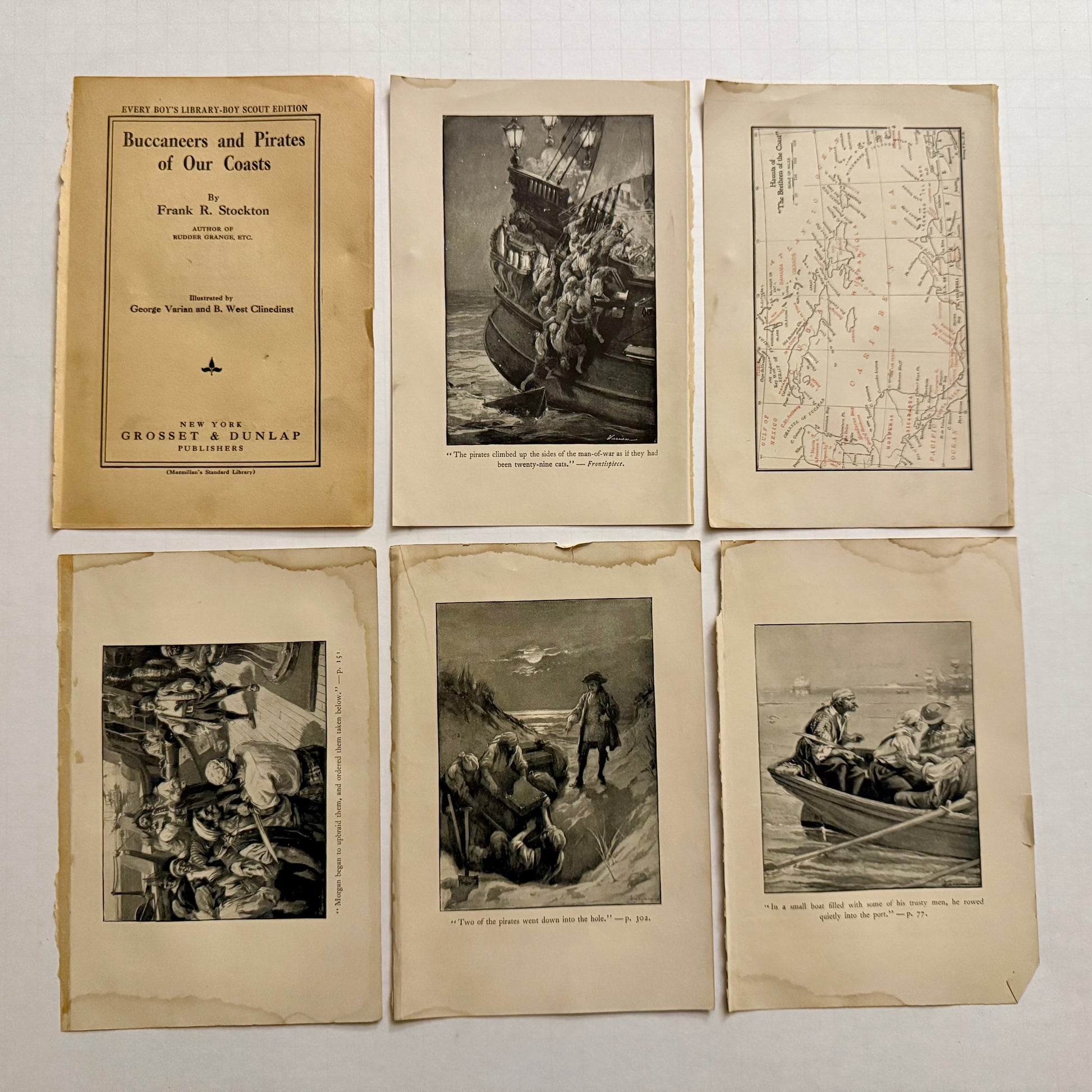 A set of six original pages from Buccaneers and Pirates of Our Coasts by Frank R. Stockton, published by Grosset & Dunlap in the early 1900s. Includes the illustrated title page, a detailed map of the Caribbean, and four full-page engravings of classic pirate adventures — battles, treasure burials, and daring escapes.