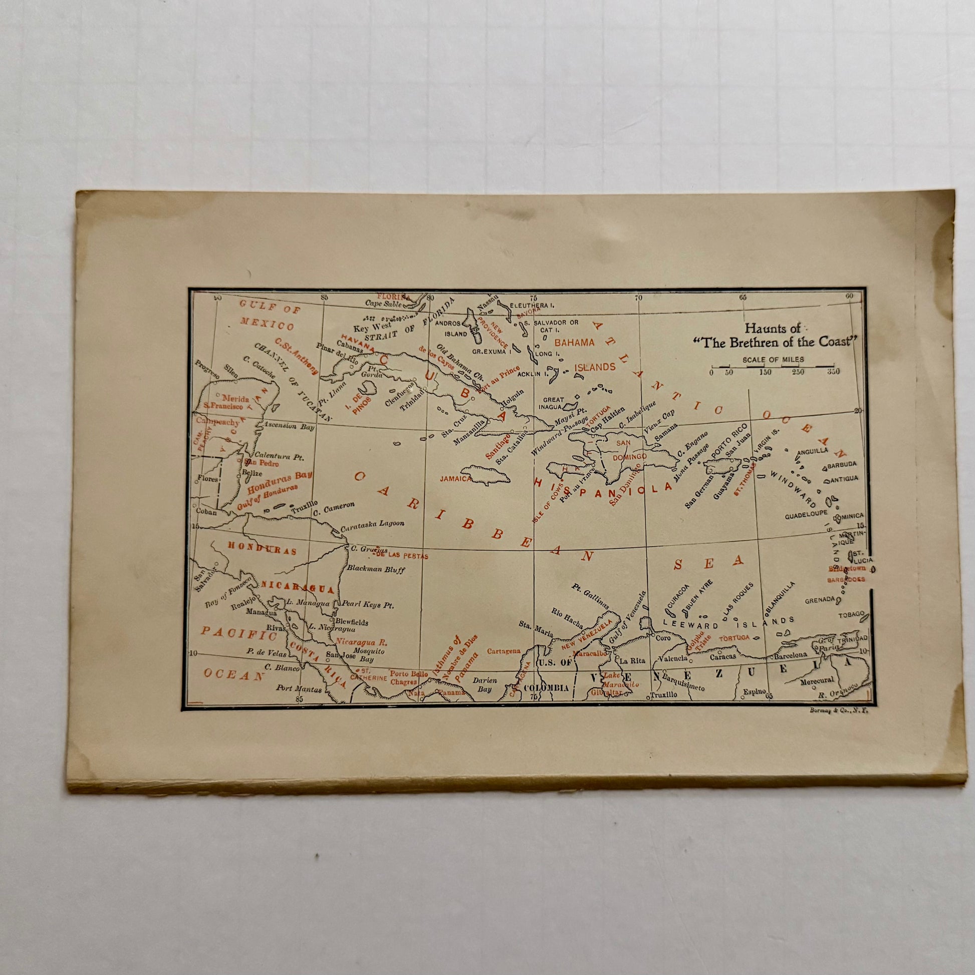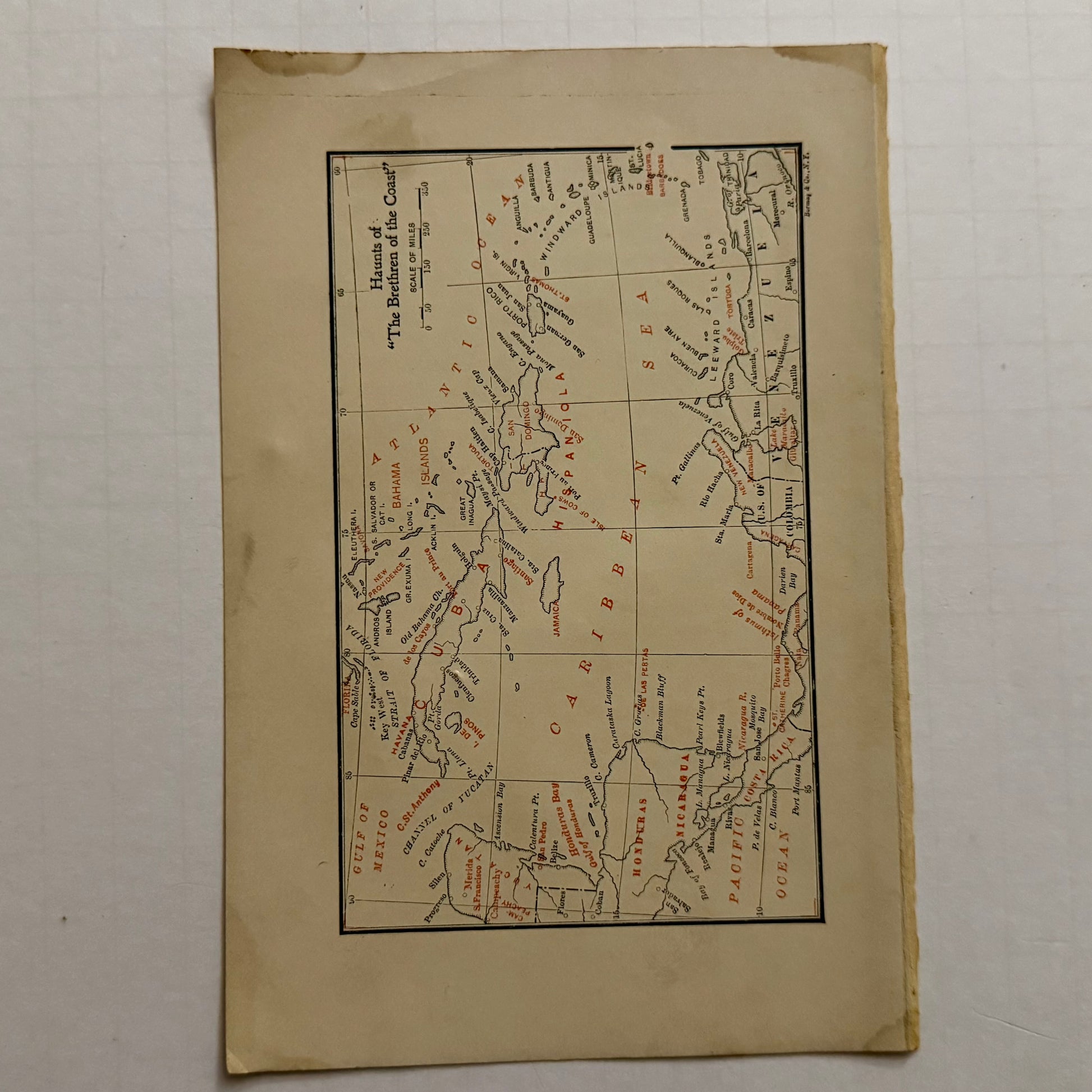 3.) Map Page: A printed map showing the Caribbean Sea and Gulf of Mexico, with routes and islands marked — illustrating pirate territory and trade routes.