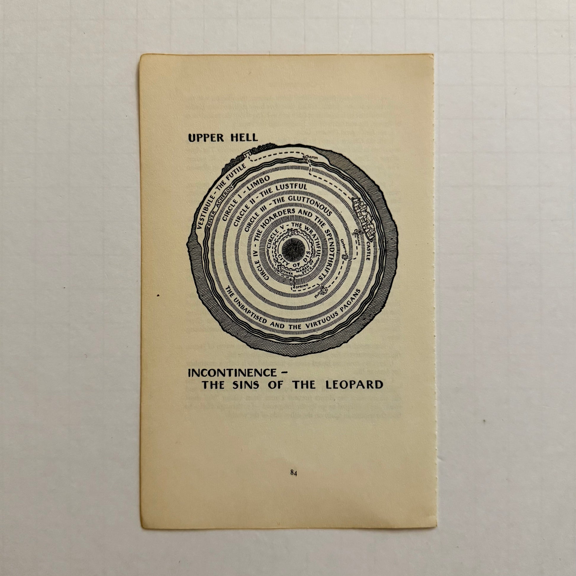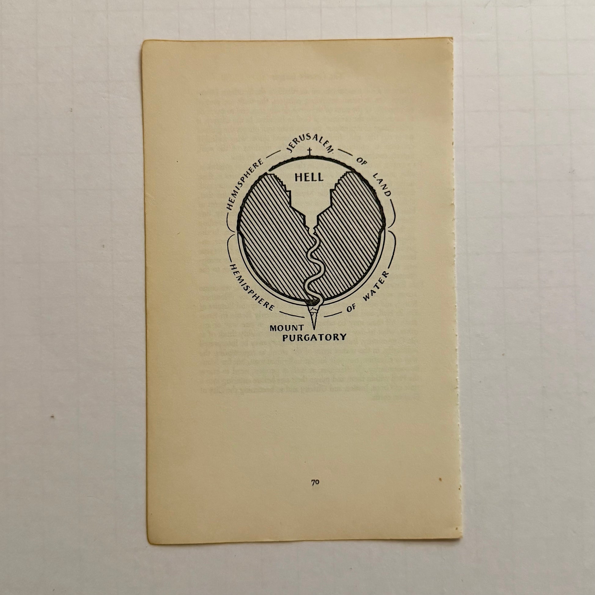 These beautifully printed illustrations map the poet’s descent through the circles of Hell — including “Upper Hell,” “Nether Hell,” “The Sins of the Leopard, Lion, and Wolf,” and the symbolic structure of Mount Purgatory. Sayers’ translation remains one of the most respected modern English interpretations of Dante, and these mid-century diagrams reflect both theological precision and graphic artistry.