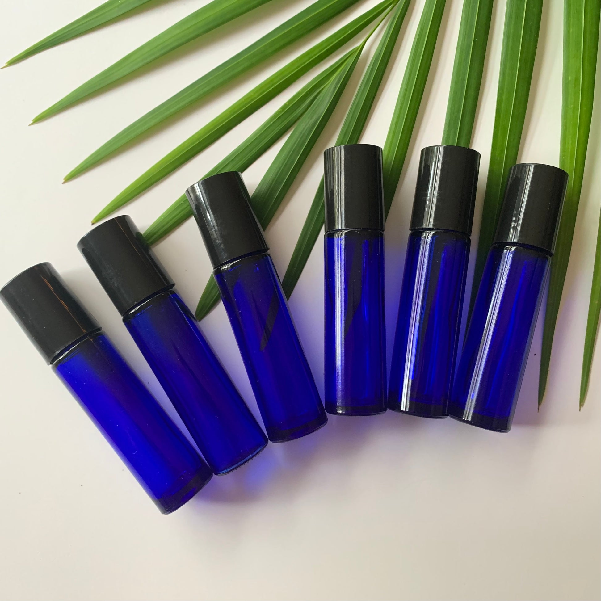 Cobalt Blue Glass Roll On Bottles, .33 oz. (10ml) 2.8' tall with plastic caps and steel roller balls.