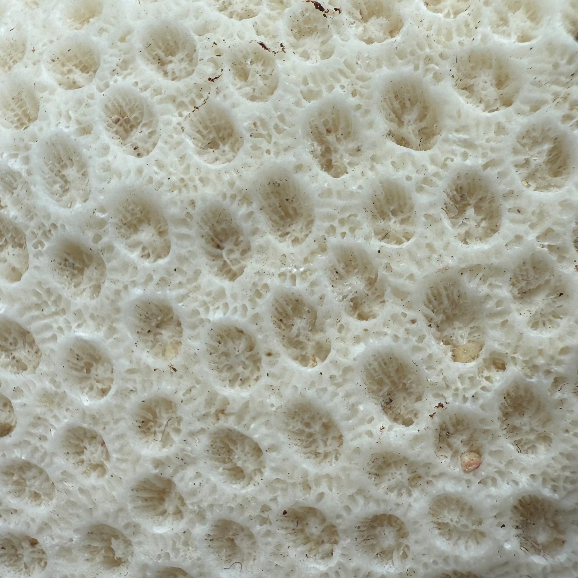 This 7.7-ounce star coral skeleton reveals the intricate lattice of coral polyps that once formed part of a thriving reef. Each small circular pattern marks where living coral polyps once grew, together creating the honeycomb-like texture unique to star coral species.