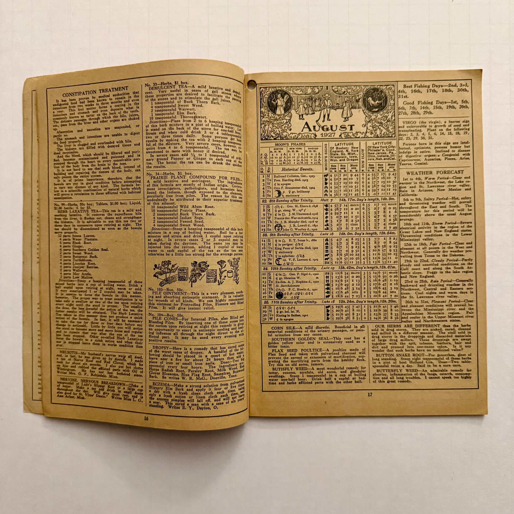 Within its pages are recipes of “Indian medicine men,” old-fashioned herbal remedies, lunar planting guides, and folk-weather predictions — a fascinating blend of folk science, practical herbalism, and mysticism. This particular printing bridges the pre-Depression optimism of the 1920s with the enduring appeal of nature-based health and spirituality.