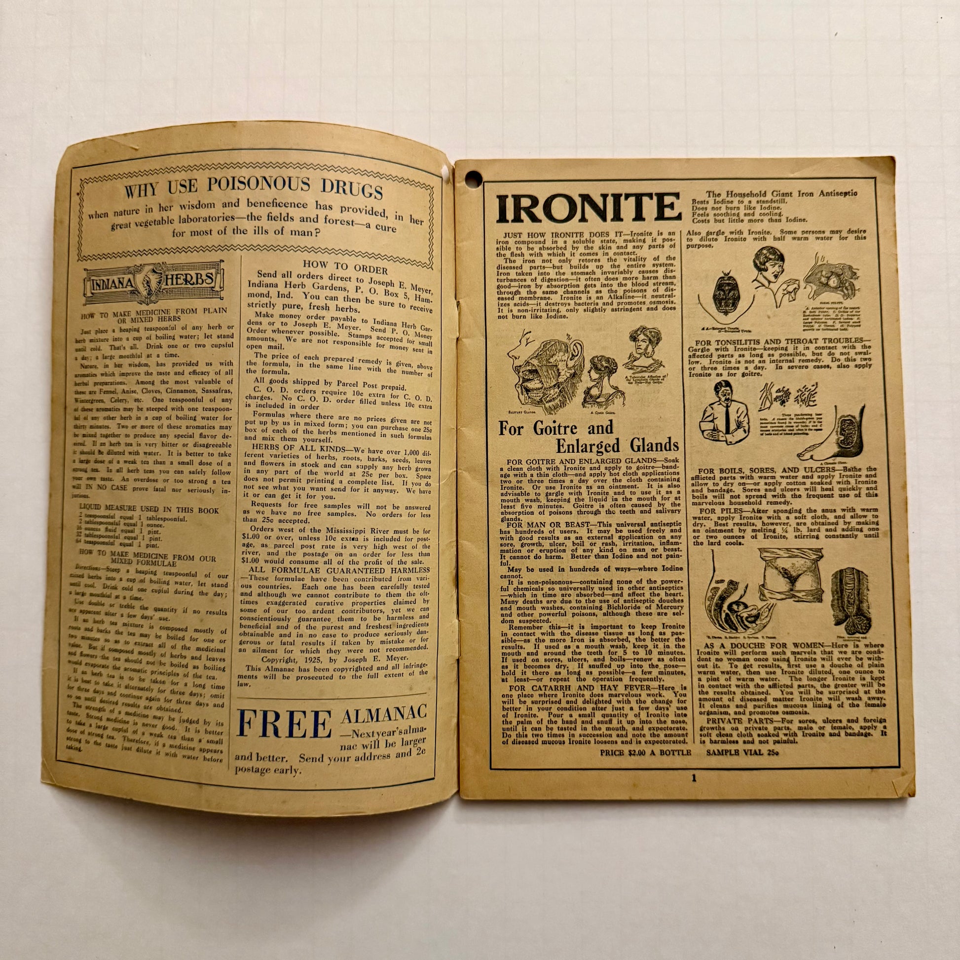 Issued in 1927, this Herbalist Almanac stands among the earliest and rarest surviving examples from the golden age of American herbal publishing. Its rich ochre cover — adorned with illustrated woodland scenes and teepee silhouettes — evokes the romanticized imagery of Native herbal traditions that shaped early 20th-century apothecary culture.