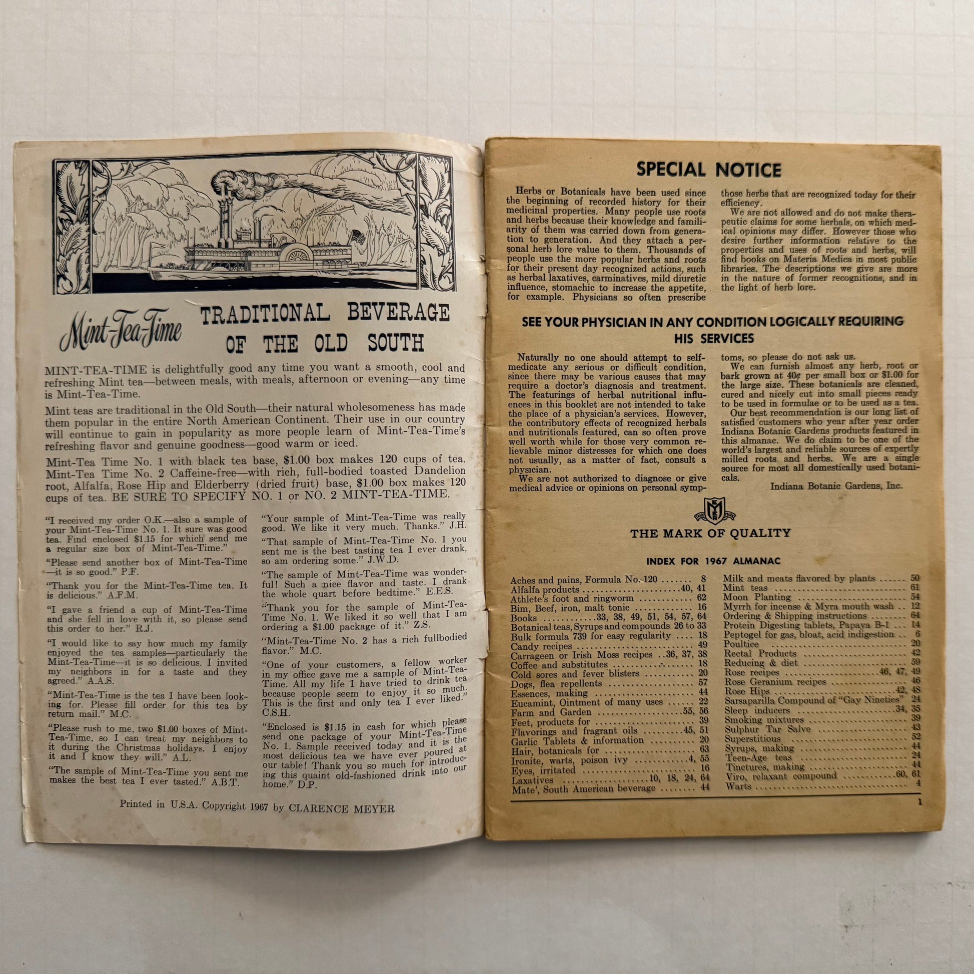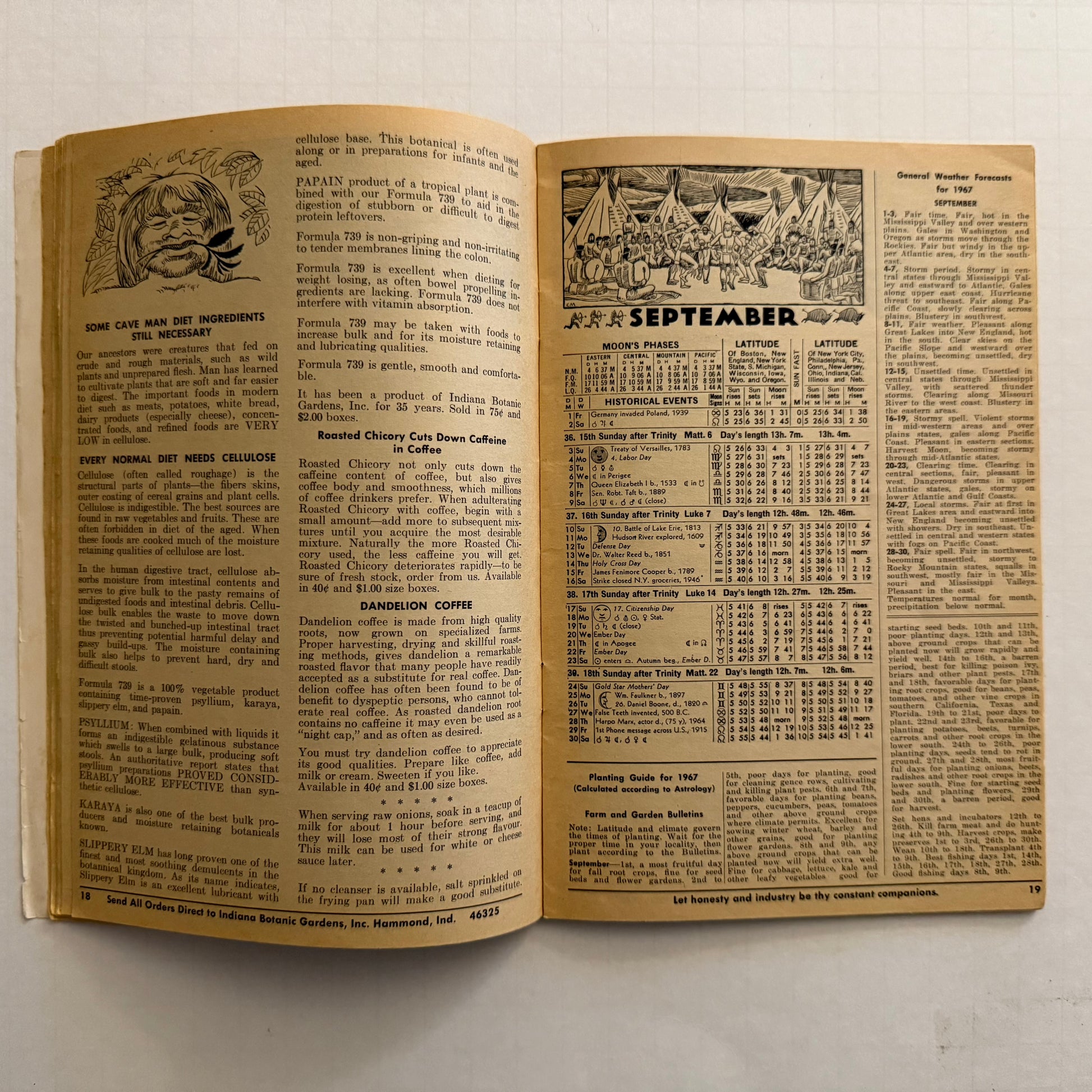 Published by Indiana Botanic Gardens (Hammond, Indiana) and originally produced under the auspices of herbalist-publisher Joseph E. Meyer, this 1967 almanac is a slim yet richly evocative 64-page softcover booklet of herb lore, native-plant wisdom, weather and planting guidance, and folklore.